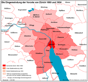 En 1934 lors du deuxième agrandissement au nord et dans la vallée de la Limmat, huit autres communes intègrent Zurich. Le découpage de certains arrondissements est revu et leur nombre passe à douze (Kreis 1 à 12).